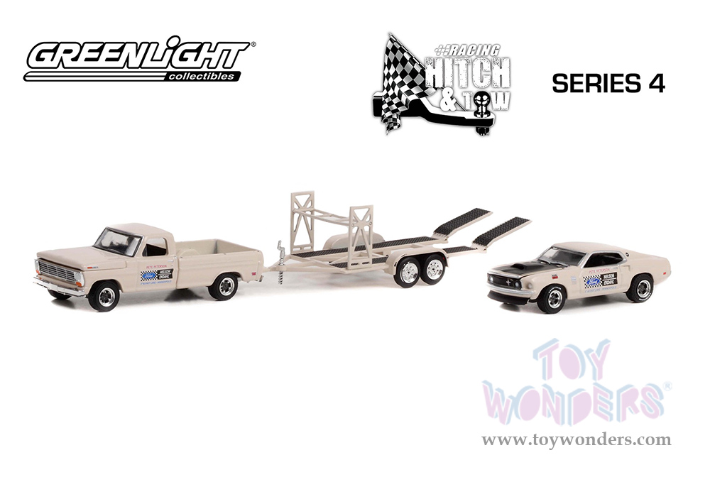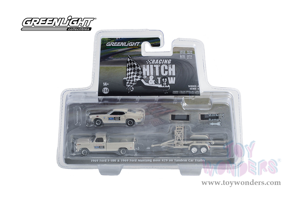 Greenlight - Hitch & Tow Series 14 | 1969 Ford F-100 Pickup Truck and 1969 Ford Mustang Boss 429 on Tandem Car Trailer (1/64 scale diecast model car, White) 31140B/24