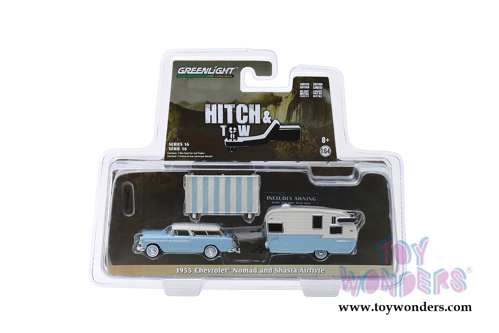 Greenlight - Hitch & Tow Series 16 | Chevrolet® Nomad and Shasta Airflyte with Awning (1955, 1/64 scale diecast model car, Light blue/Cream) 32160A/24
