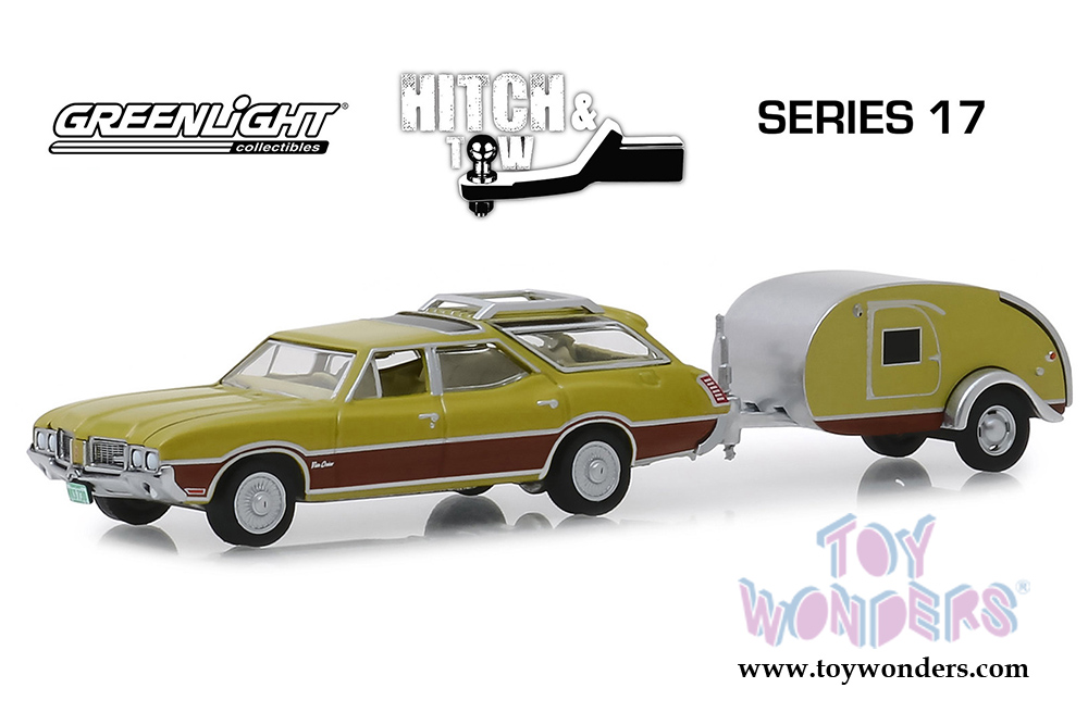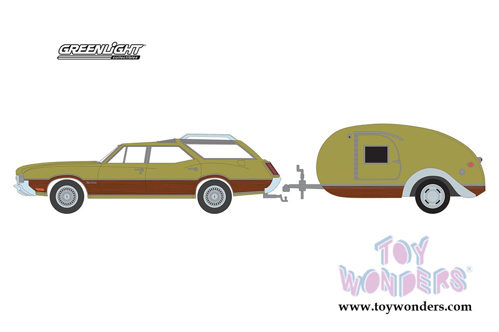 Greenlight - Hitch & Tow Series 17 | Oldsmobile Vista Cruiser and Teardrop Travel Trailer (1971, 1/64 scale diecast model car, Green) 32170A/24