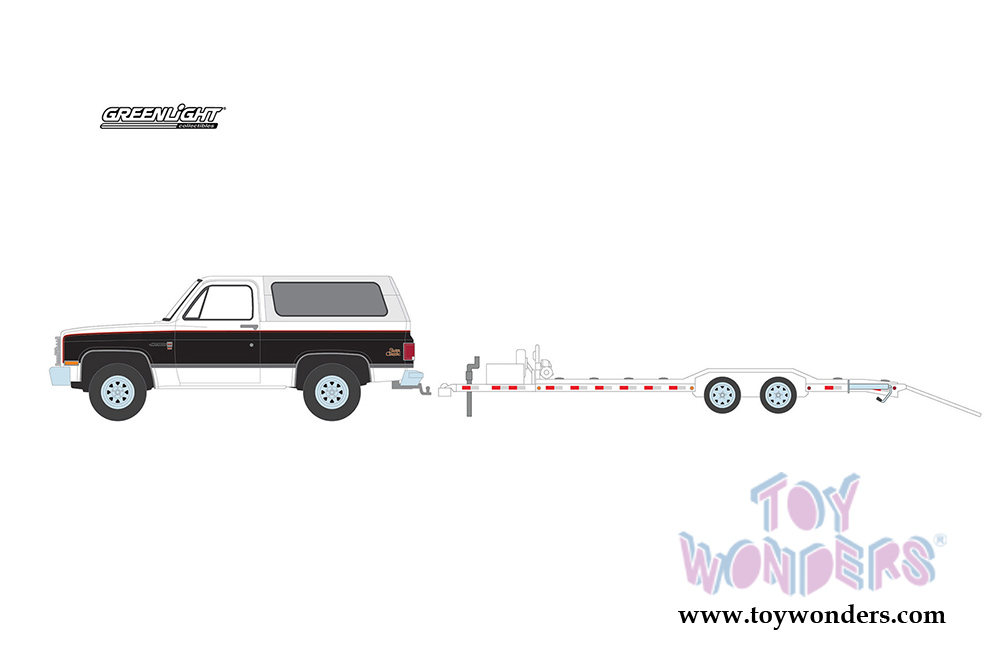 32210A/24 Greenlight - Hitch & Tow Series 21 - 1983 GMC® Jimmy Sierra Classic with Heavy Duty Flatbed Car Hauler (6 pcs. set). 1:64 scale diecast collectible model car. The GMC® Pickup and the trailer are 7" long. 6 pc set. Each set individually blister carded. Card size: 8.5" x 6.5". These cars are manufactured by Greenlight. Limited Edition. Item 32210A/24 comes in Pearl White and Black.