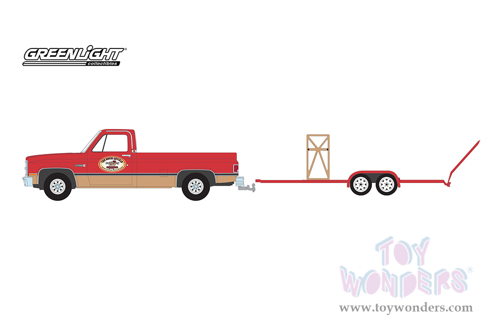 Greenlight - Hitch & Tow Series 25 | GMC® K-2500 Sierra Grande Wideside Pickup Truck Busted Knuckle Garage and Tandem Car Trailer (1982, 1/64 scale diecast model car, Red and Beige) 32250B/24