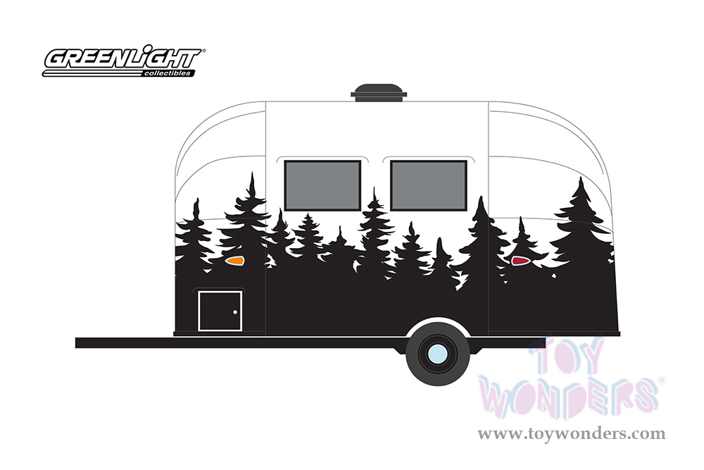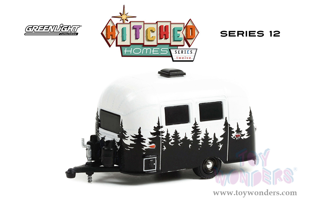 Greenlight - Hitched Homes Series 12 | Airstream 16’ Bambi Travel Trailer (1961, 1/64 scale diecast model car, White with Black Forest Mural) 34120E/48