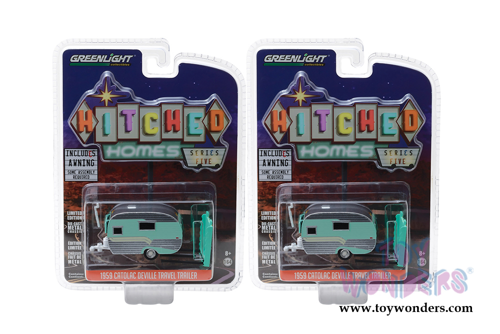 Greenlight - Hitched Homes Series 5 | Catolac Deville Travel Trailer (1959, 1/64 scale diecast model car, Chrome/Aqua) 34050B/48