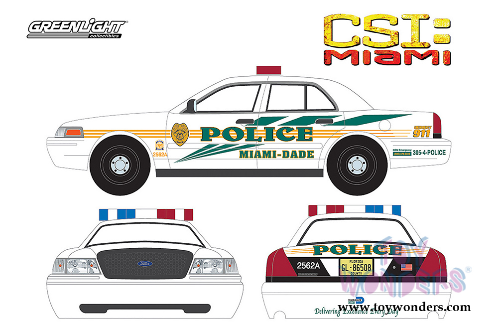 86508 Greenlight Hollywood - CSI: Miami (2002-2012 TV Series) - 2003 Ford Crown Victoria Police Interceptor Miami-Dade Police. 1:43 scale diecast collectible model car. This 2003 Ford Victoria is 5" long diecast collection car. It sits on a display plaque. This Police car is manufactured by Greenlight. Item 86508 is in WHITE. Individually packed in a hard-plastic case. Case size: 6.5"L x 3"W x 2.75"H. 12 pcs. per inner