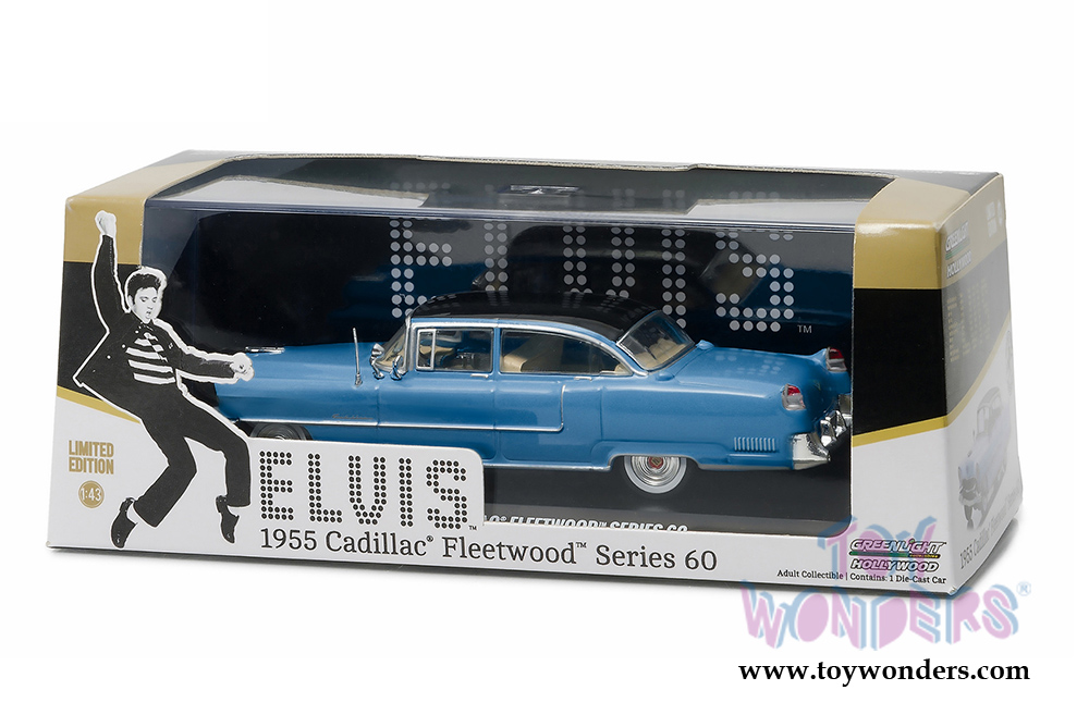 86493 Greenlight Hollywood - Elvis Presley 1955 Cadillac Fleetwood Series 60 Hardtop. 1:43 scale diecast collectible model car. This '55 Cadillac is 5" long diecast collection car. It sits on a display plaque. This 1955 Cadillac is manufactured by Greenlight. Item 86493 is in BLUE color with Black roof. Individually packed in a hard-plastic case. Case size: 7.25"L x 3.25"W x 2.75"H.