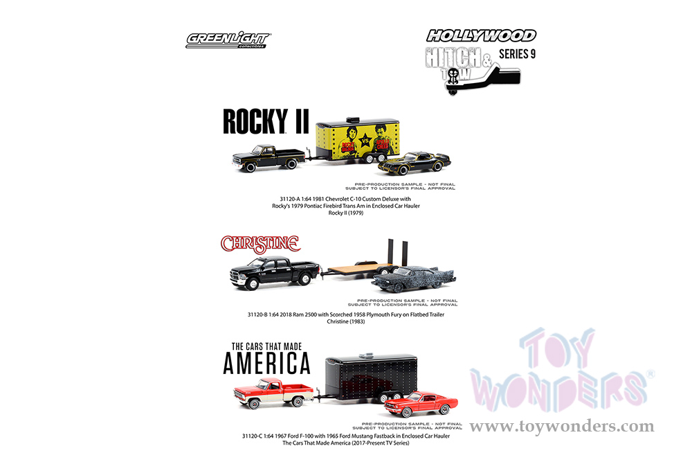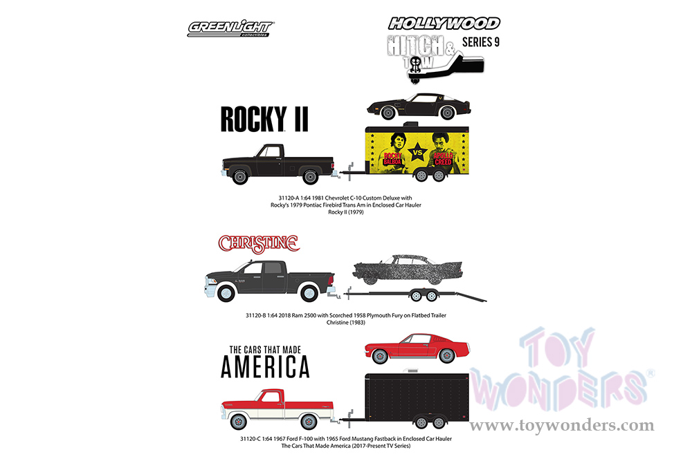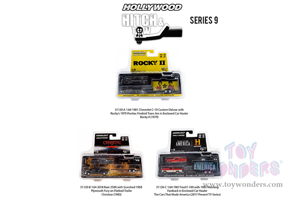 31120/24 Greenlight - Hollywood Hitch & Tow Series 9 (6 pcs. set). 1:64 scale diecast collectible model car. The cars are about 3" long, the trucks are about 3.75" long as well as the trailers/haulers. Together 7" long. 6 pc set, limited edition. Each set individually blister carded. Card size: 7.5" x 10". These cars are manufactured by Greenlight. Item 31120/24 Comes in assorted colors and styles.