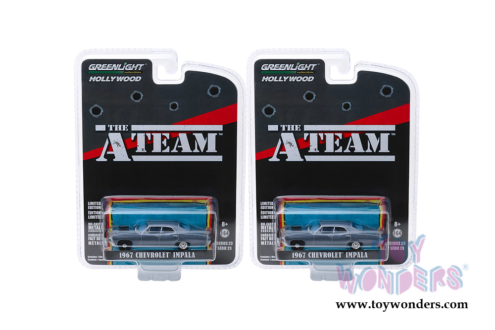 44830D/48 Greenlight Hollywood Series 23 | The A-Team (TV Series, 1983-87) 1967 Chevrolet® Impala™ Sedan. Greenlight has put the love of the silver screen into something slightly smaller with 1:64th scale replicas. Greenlight Hollywood takes iconic film and television vehicles from both the past and present and brings them to life with four-wheeled diecast replicas. 1:64 scale diecast collectible model. This Chevy® is 3" long diecast model cars. Each car individually blister carded. Card size: 5.5" x 7.5". Manufactured by Greenlight.