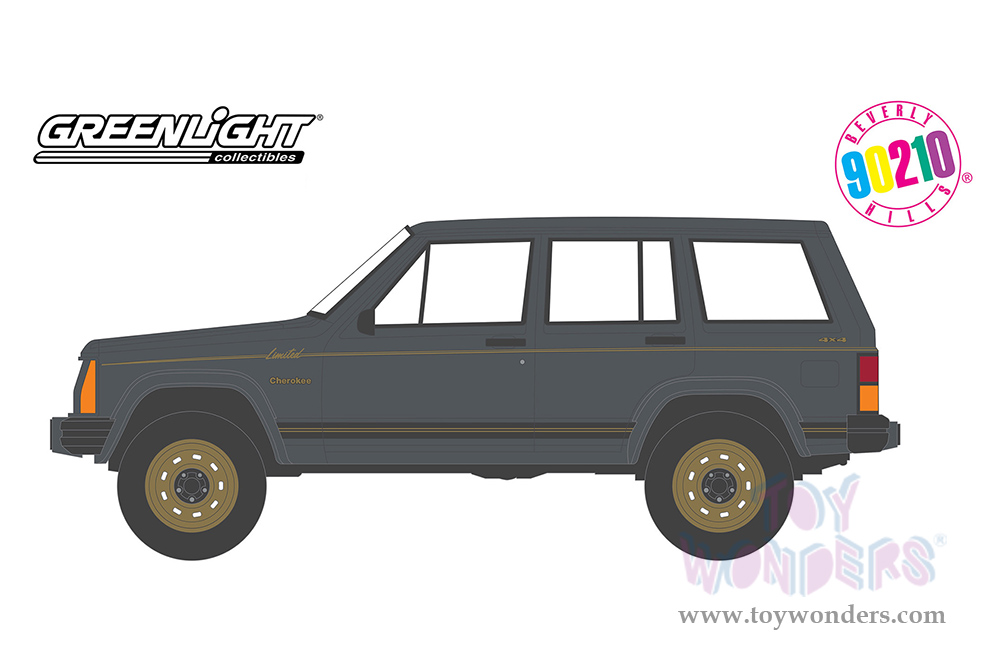 44930A/48 Greenlight Hollywood 33 | 1988 Jeep® Cherokee Limited "Beverly Hills, 90210" (1990-2000) TV Series. Greenlight has put the love of the silver screen into something slightly smaller with 1:64th scale replicas. Greenlight Hollywood takes iconic film and television vehicles from both the past and present and brings them to life with four-wheeled diecast replicas. 1:64 scale diecast collectible model. This Jeep® is a 2.5" long diecast model car. Each car individually blister carded. Card size: 5.5" x 7.5". Manufactured by Greenlight.