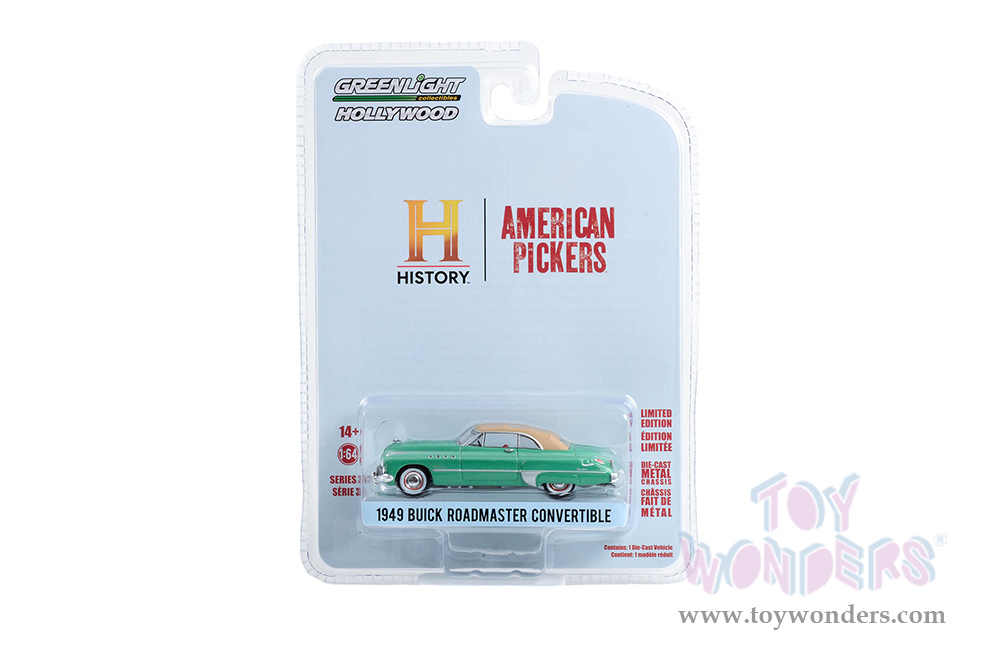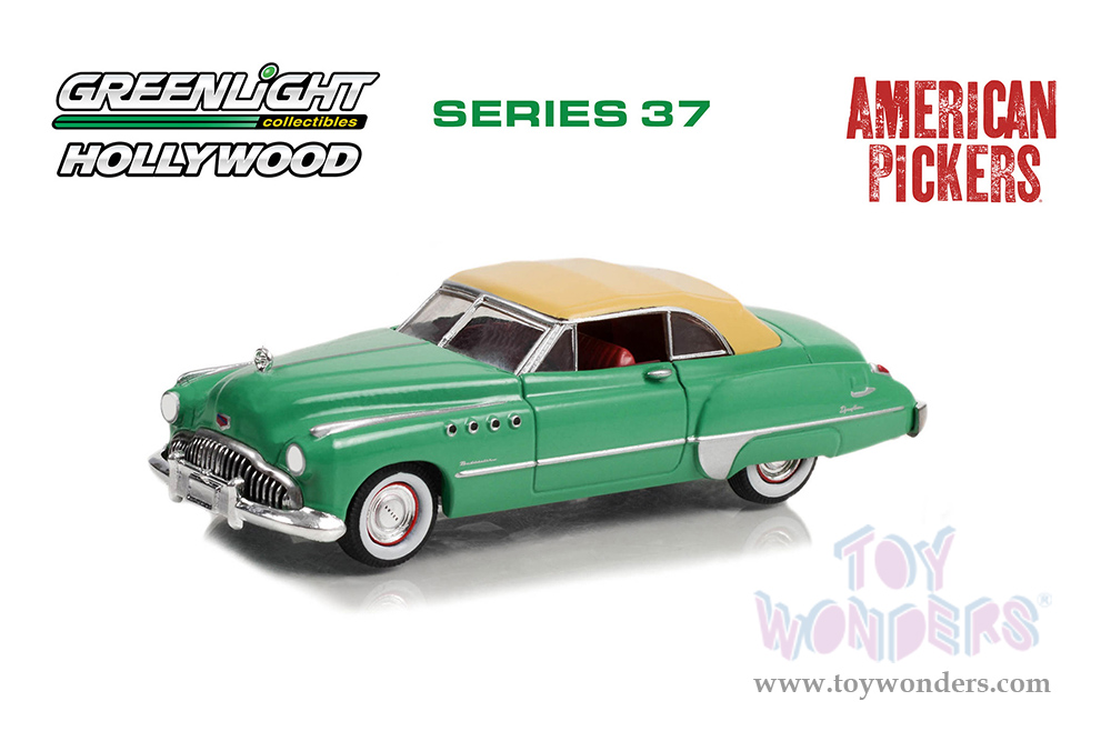44970D/48 Greenlight Hollywood 37 | 1949 Buick Roadmaster Convertible "American Pickers" (2010-Current) TV Series. Greenlight has put the love of the silver screen into something slightly smaller with 1:64th scale replicas. Greenlight Hollywood takes iconic film and television vehicles from both the past and present and brings them to life with four-wheeled diecast replicas. 1:64 scale diecast collectible model. This Buick is a 3.25" long diecast model car. Each car individually blister carded. Card size: 5.5" x 7.5". Manufactured by Greenlight.