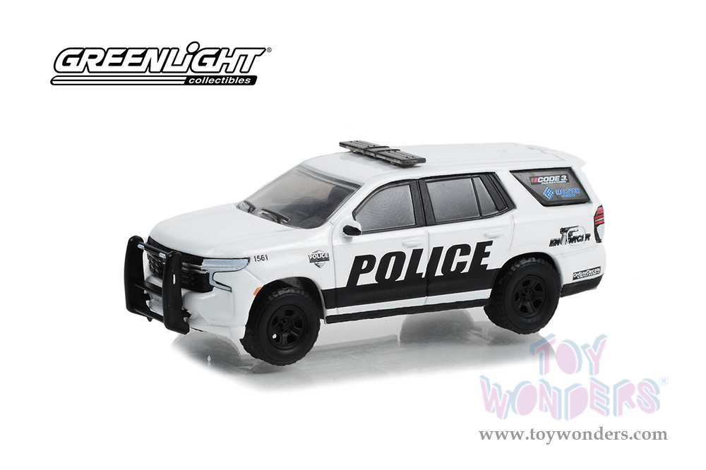 30356/48 Greenlight - Hot Pursuit | 2021 Chevrolet® Tahoe Police Pursuit Vehicle (PPV) - General Motors Fleet Police Show Vehicle. 1:64 scale diecast collectible model car. This Chevy® Police car is a 3" long diecast metal car. Each car individually blister carded. 12 pcs/inner. Card size: 5.75" x 7.75". This Police car is manufactured by Greenlight. 30356/48 is in Black and White.