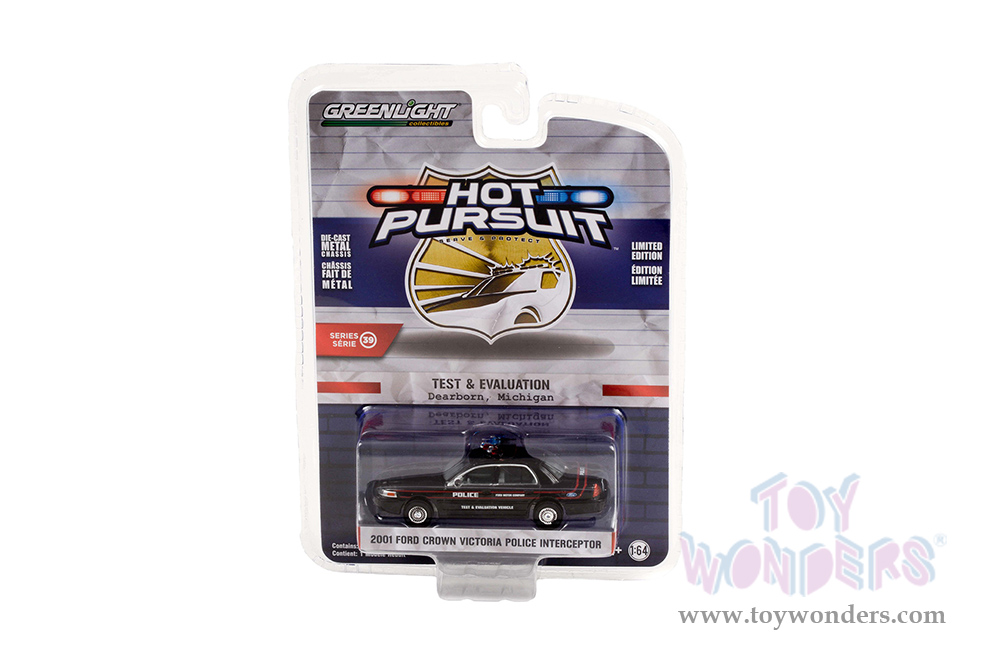 Greenlight - Hot Pursuit Series 39 | Ford Crown Victoria Police Interceptor Police Prep Package "Test & Evaluation Vehicle" Dearborn (Michigan) (2001, 1/64 scale diecast model car, Black) 42970D/48