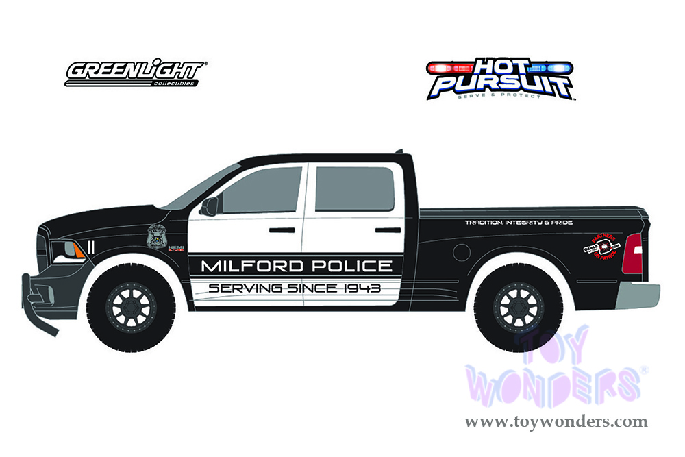Greenlight - Hot Pursuit Series 40 | Ram 1500 SSV 4x4 Pickup Truck with Bed Cover "Serving Since 1943" "Milford Police Department" (Michigan) (2017, 1/64 scale diecast model car, White and Black) 42980E/48