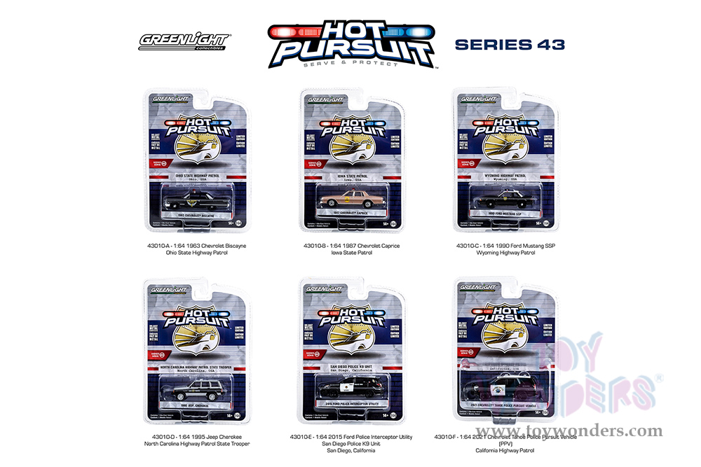 43010/48 Greenlight - Hot Pursuit Series 43 (six-piece set). 1:64 scale diecast collectible model. These cars are approximately 2.75" to 3.75" long diecast metal cars. Each car individually blister carded. Card size: 7.5" x 5.75". 6 pcs/inner. Manufactured by Greenlight. 43010/48 is in assorted colors.