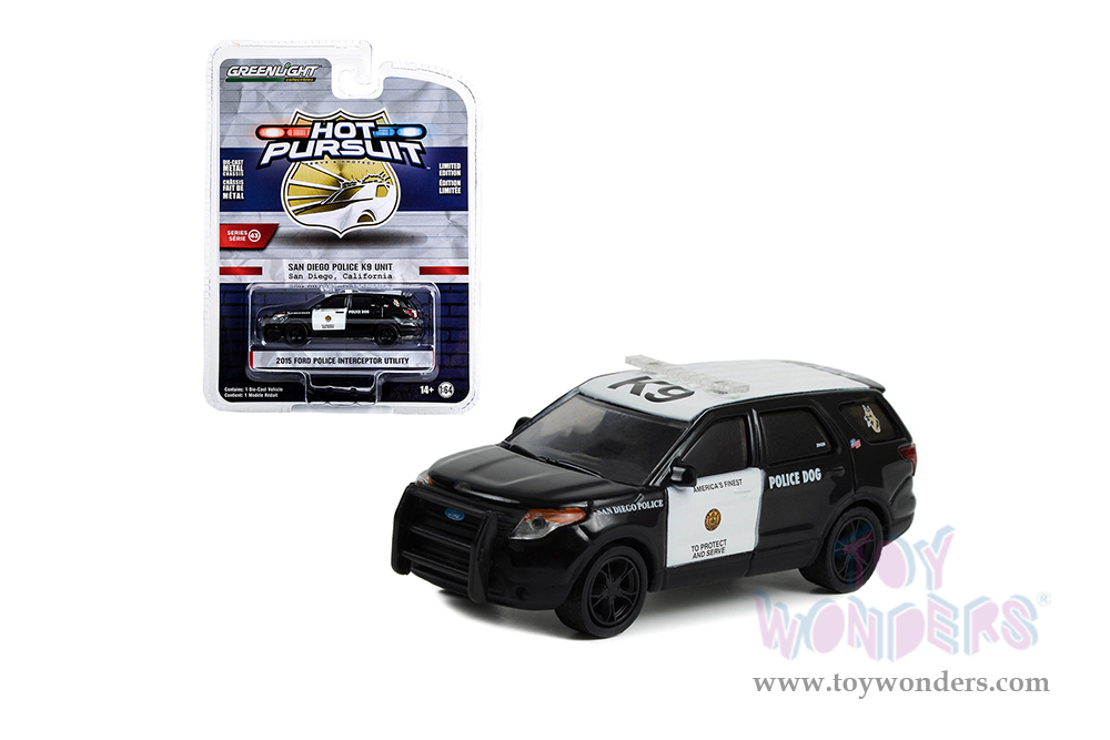 43010E/48 Greenlight - Hot Pursuit Series 43 | 2015 Ford Police Interceptor Utility "San Diego Police K9 Unit, San Diego, California". 1:64 scale diecast collectible model. These cars are 3" long diecast metal cars. Each car individually blister carded. Card size: 7.5" x 5.75". 6 pcs/inner. Manufactured by Greenlight. 43010E/48 is in Black and White.