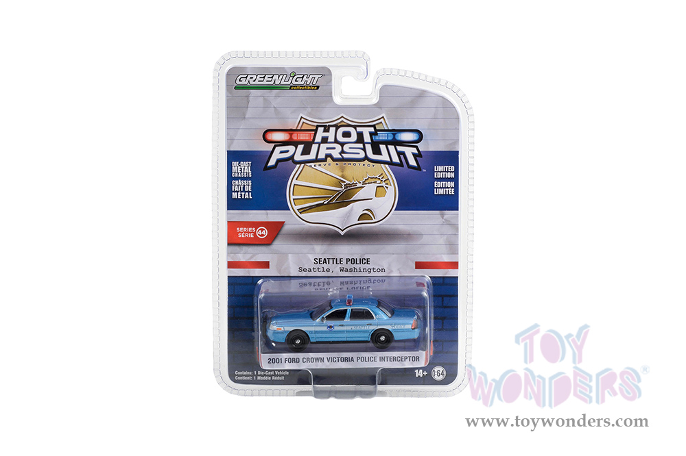 Greenlight - Hot Pursuit Series 44 | Ford Crown Victoria Police Interceptor "Seattle Police, Seattle Washington" (2001, 1/64 scale diecast model car, Light Blue/White stripe) 43020D/48