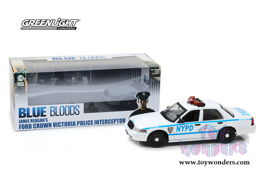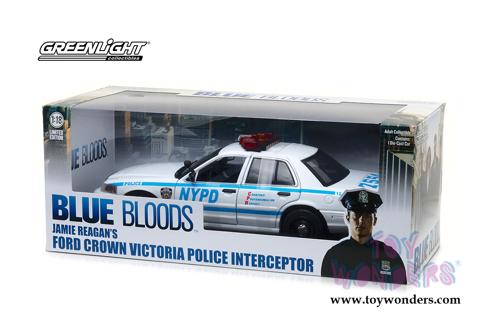 13513 Greenlight - Jamie Reagan's 2001 Ford Crown Victoria Police Interceptor NYPD from "Blue Bloods" 2010 TV Series. 1:18 scale diecast collectible model car. This Ford Crown Victoria Police car is an 11"L x 4"W x 3.5"H diecast collection car. This Police Car is manufactured by Greenlight. Limited Edition, adult collection. 13513 is in WHITE/BLUE color. Individually packed in a window box WB. Box size: 14"L x 6.5"W x 5.5"H.