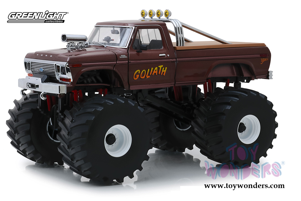 13540 Greenlight - Kings of Crunch Ford F-250 Monster Truck (with 66-inch Tires) - Goliath. 1:18 scale diecast collectible model. This Ford monster truck is a 12.5"L x 5.75"W x 6.5"H diecast metal car. This '79 monster truck is manufactured by Greenlight. Limited Edition. 13540 is in BROWN color. Individually packed in a box. Box size: 15.5"Lx 10"Wx 9.5"H.