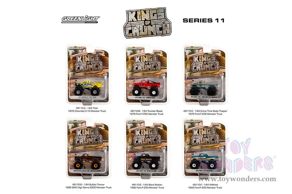 49110/48 Greenlight - Kings of Crunch Series 11 (6 pcs. set). 1:64 scale diecast collectible model car. Dimensions of each Monster Truck is 3.5" Long. 6 pc set, limited edition. Have rubber tires, metal body and chassis. Officially licensed product. Each car individually blister carded. Card size: 7.5" x 5.5". These cars are manufactured by Greenlight. Item 49110/48 comes in assorted colors and styles.