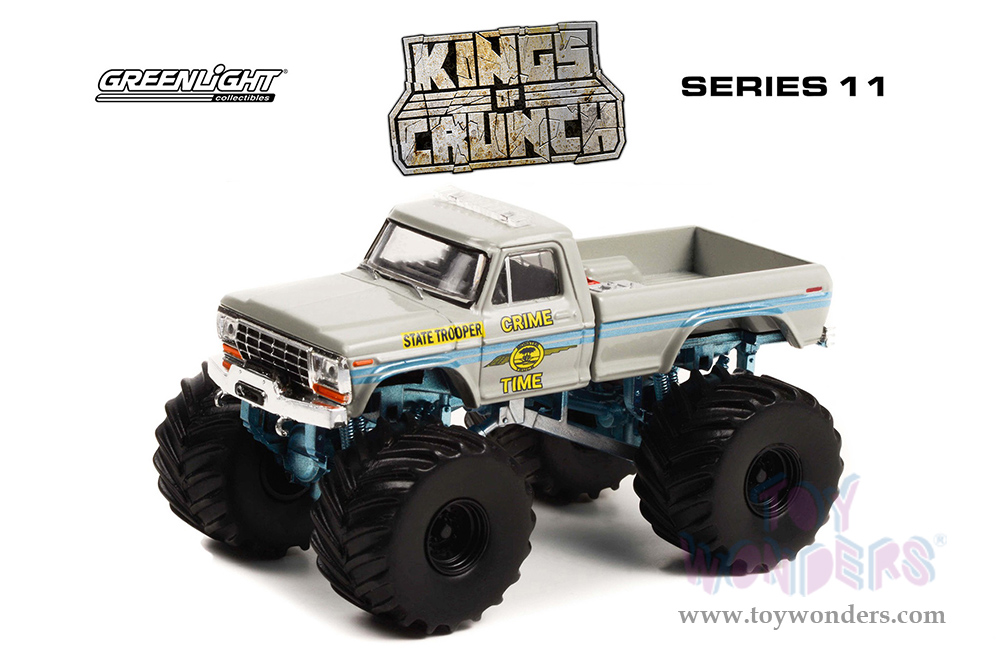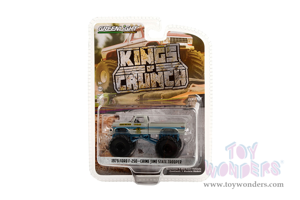 49110C/48 Greenlight - Kings of Crunch Series 11 | 1979 Ford F-250 Monster Truck - Crime Time State Trooper (6 pcs. set). 1:64 scale diecast collectible model car. Dimensions of each Monster Truck is 3.5" Long. 6 pc set. Each car individually blister carded. Card size: 7.5" x 5.5". These cars are manufactured by Greenlight. Item 49110C/48 is in beige.