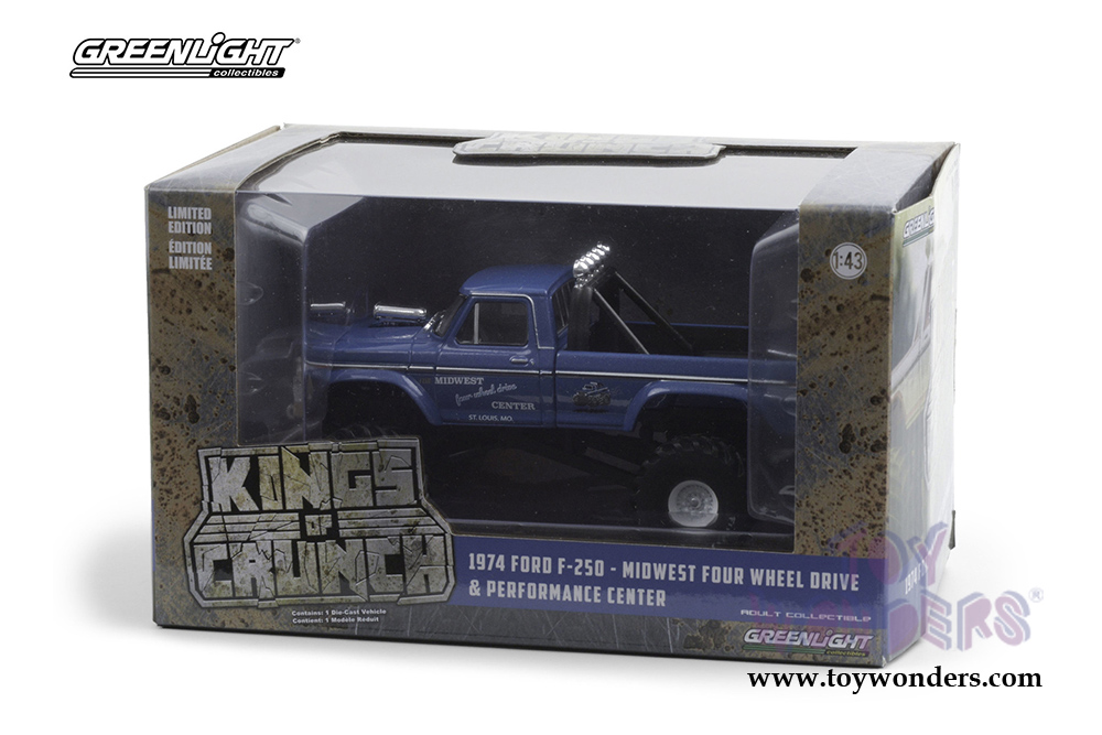 Greenlight - Kings of Crunch Series 3 | Ford F-250 Monster Truck (with 48-Inch Tires) Midwest Four Wheel Drive & Performance Center (1974, 1/43 scale diecast model car, Blue) 88031