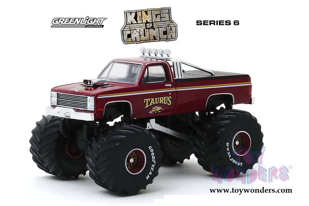 49060D/48 Greenlight - Kings of Crunch Series 6 | 1986 Chevrolet® K20 Monster Truck - Taurus (6 pcs. set). 1:64 scale diecast collectible model car. Dimensions of each Monster Truck is 3.5" Long. 6 pc set. Each car individually blister carded. Card size: 7.5" x 5.5". These cars are manufactured by Greenlight. Item 49060D/48 is in Burgundy color.