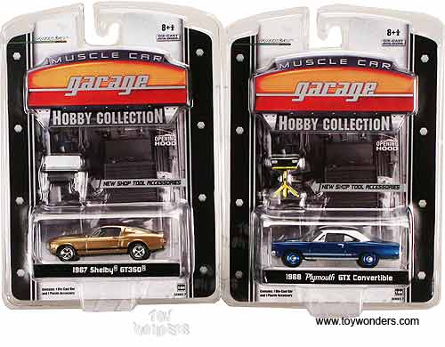 28620/12 Greenlight Muscle Car Garage - Hobby Collection Series 2. 3" long die cast cars with openable hood. Each car individually blister carded. Bonus shop tool accessories. Card size: 5.5" x 7.5". These cars are manufactured by Greenlight. GM is a trademark of the General Motors Corporation. Assortment includes: