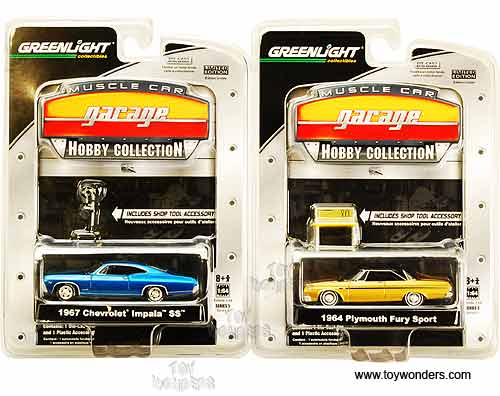 28650/48 Greenlight Muscle Car Garage - Hobby Collection Series 5 with Shop Tool Accessories. 3" long die cast cars with openable hood. Each car individually blister carded. Bonus shop tool accessories. 12 pcs/inner. Card size: 5.5" x 7.5". These cars are manufactured by Greenlight. GM is a trademark of the General Motors Corporation. Assortment includes: