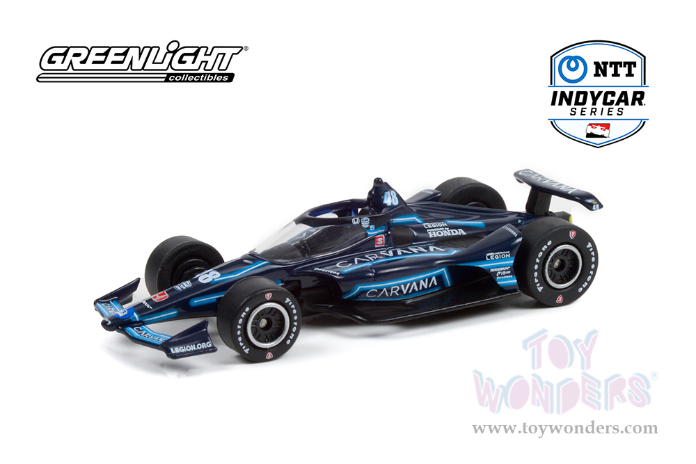 11518/48 Greenlight - NTT IndyCar Series #48 Jimmie Johnson / Chip Ganassi Racing, Carvana 'Drive the Vote' GMR Grand Prix Blue Steel Livery. 1:64 scale diecast collectible model. This Race Car is a 3" long diecast metal car. Each car individually blister carded. Card size: 5.75" x 7.5". 12 pcs/inner. Manufactured by Greenlight. 11518/48 is in black with blue stripes.