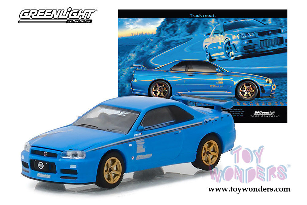 Greenlight - Nissan Skyline GT-R (BNR34) "Track Meat" BFGoodrich Vintage Ad Car (2001, 1/64 scale diecast model car, Blue) 29944/48