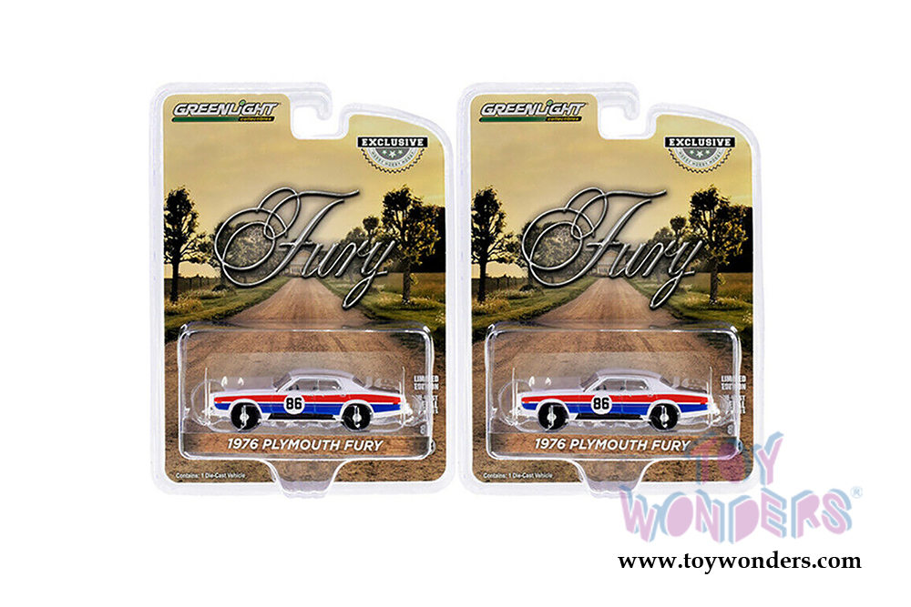 Greenlight - Plymouth Fury #86 - Hazzard County Road Rally (1976, 1/64 scale die cast model car, White/Red/Blue) 30156/48