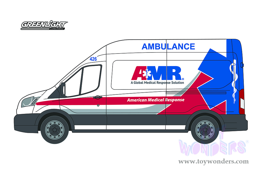 53030F/48 Greenlight - Route Runners Series 3 | 2019 Ford Transit LWB High Roof Van Ford Transit LWB High Roof Van Ambulance "AMR" (American Medical Response). 1:64 scale diecast collectible model. This Van is a 3.25"L x 1.25"W x 1.25"H long diecast metal car. Each car individually blister carded. Card size: 5.5" x 7.5". 6 pcs/inner. Manufactured by Greenlight. 53030F/48 is in White.