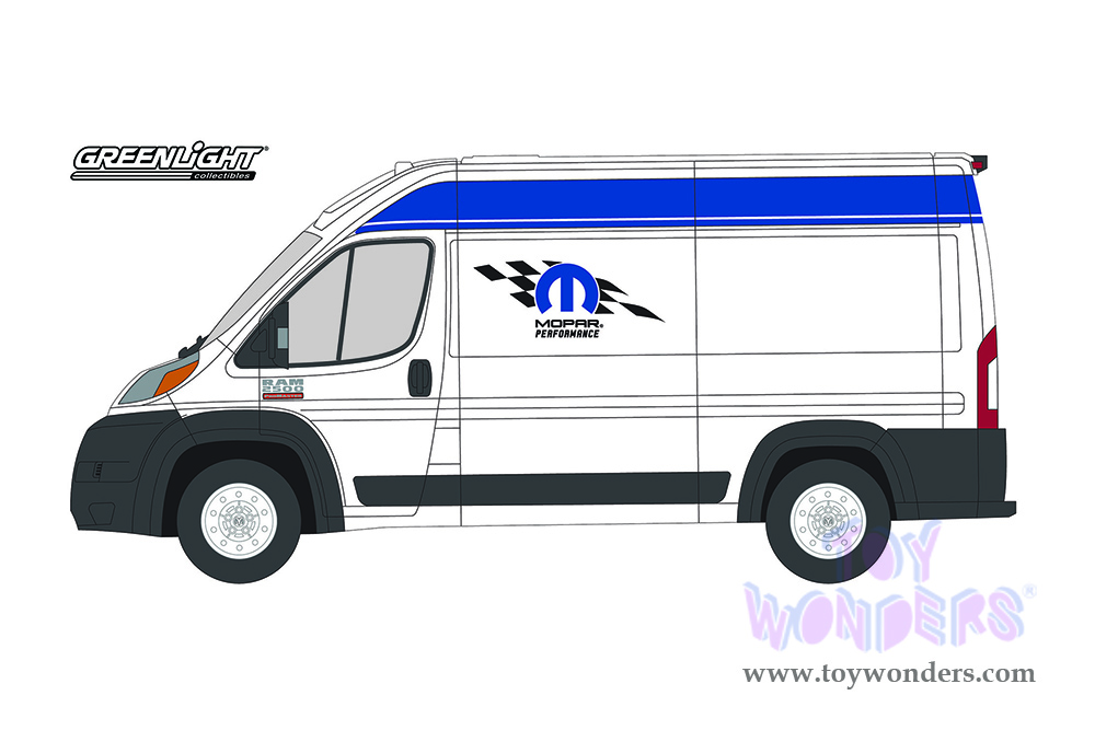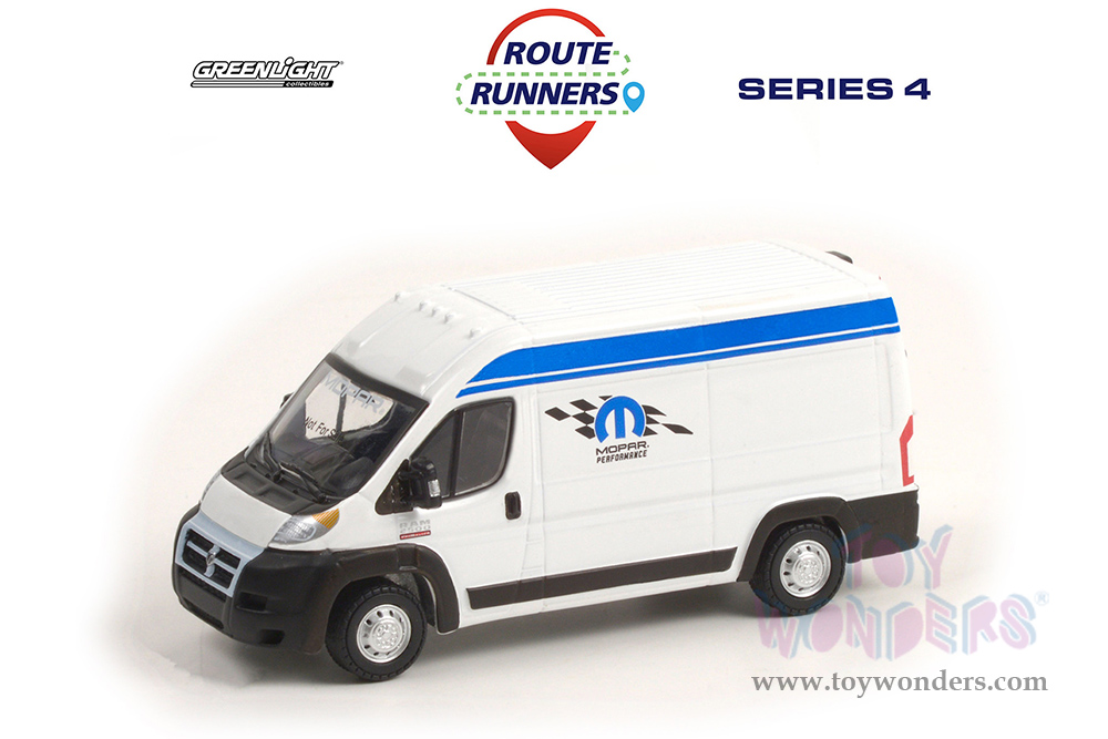 Greenlight - Route Runners Series 4 | Dodge Ram ProMaster Van "Mopar Performance" (2014, 1/64 scale diecast model car, White/Blue stripes) 53040A/48