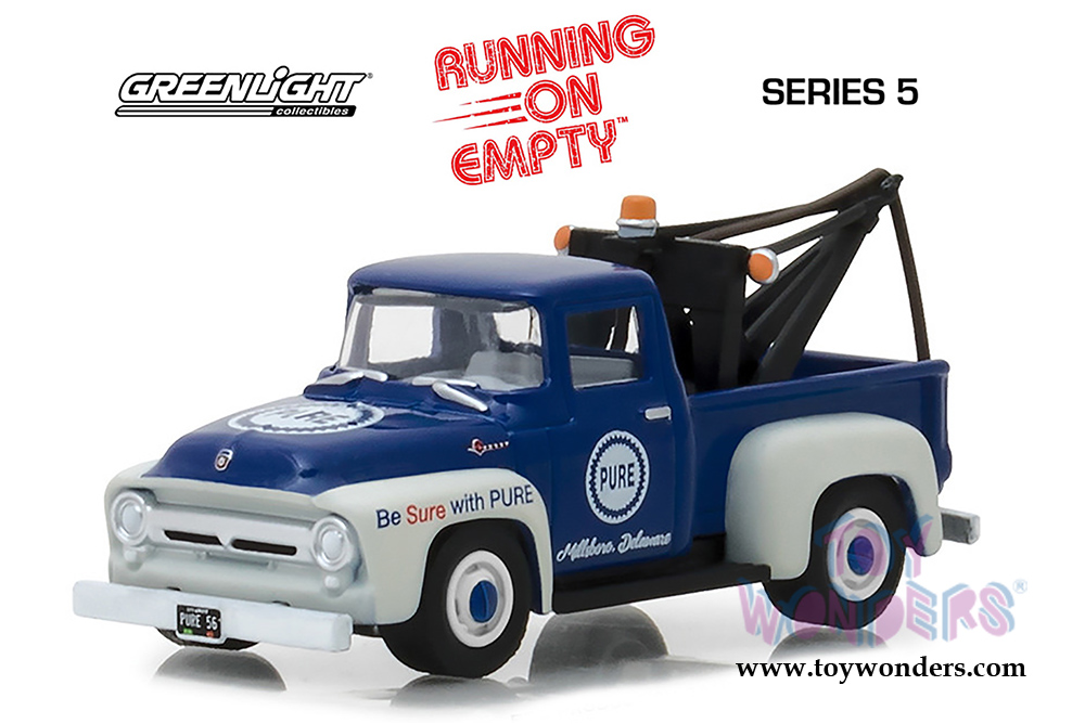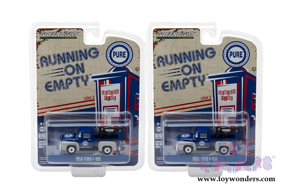 41050A/48 Greenlight - Running on Empty Series 5 | 1956 Ford F-100 with Drop-in Tow Hook Pure Oil "Be Sure with Pure" (6 pcs. set). 1:64 scale diecast collectible model car. These trucks are about 3" long. 6 pc set, limited edition. Each car individually blister carded. Card size: 7.5" x 5.5". These cars are manufactured by Greenlight. Item 41050A/48 comes in BLUE color with white.