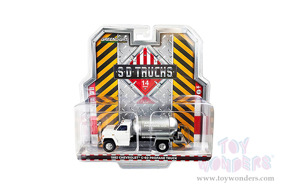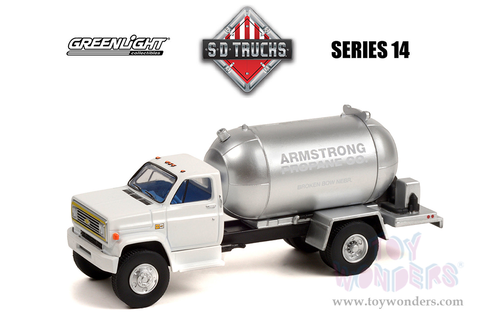 45140B/48 Greenlight - S.D. Trucks Series 14 | 1982 Chevrolet® C-60 Propane Truck "Armstrong Propane Co.". 1:64 scale diecast collectible model car. This Propane Truck is a 4.75"L x 1.25"W x 2"H diecast metal car. Limited edition. Each individually blister carded. Card size: 8.5" x 8.5". These trucks are manufactured by Greenlight. 45140B/48 is in White Cab with silver Tank.