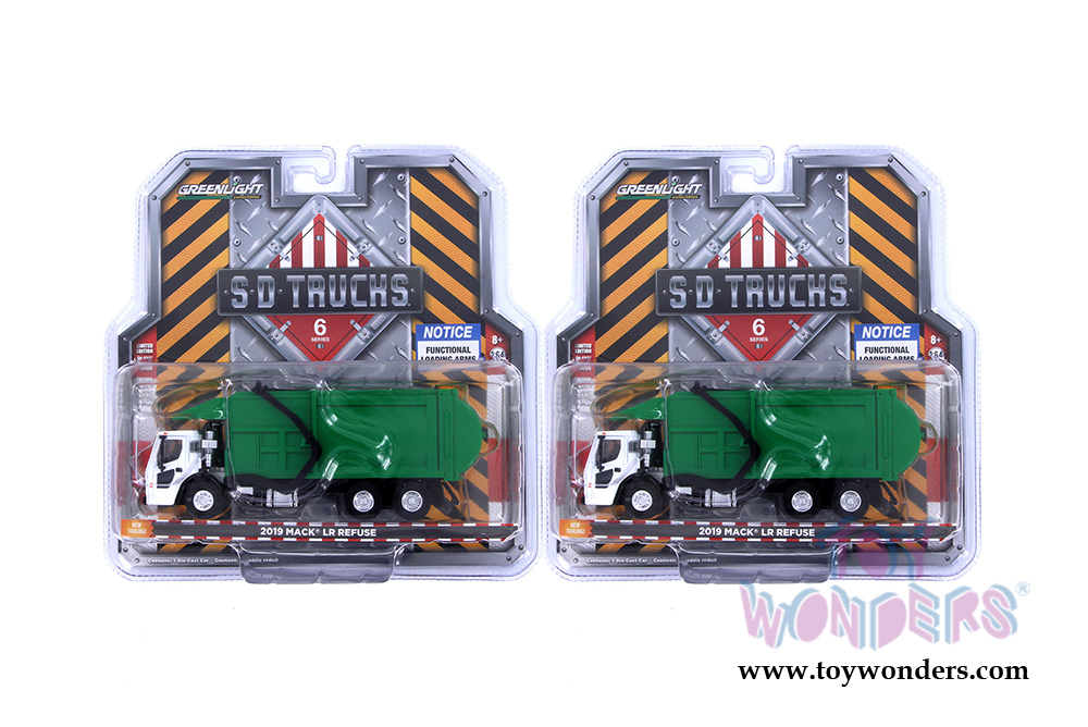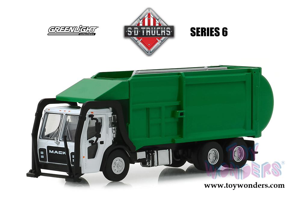 45060C/48 Greenlight - S.D. Trucks Series 6 | 2019 Mack® LR Refuse Truck. 1:64 scale diecast collectible model car. This Refuse Truck is a 6"L x 1.5"W x 2.5"H diecast metal car. Limited edition. Each individually blister carded. Card size: 8.5" x 8.5". These trucks are manufactured by Greenlight. 45060C/48 is in White with Green color.