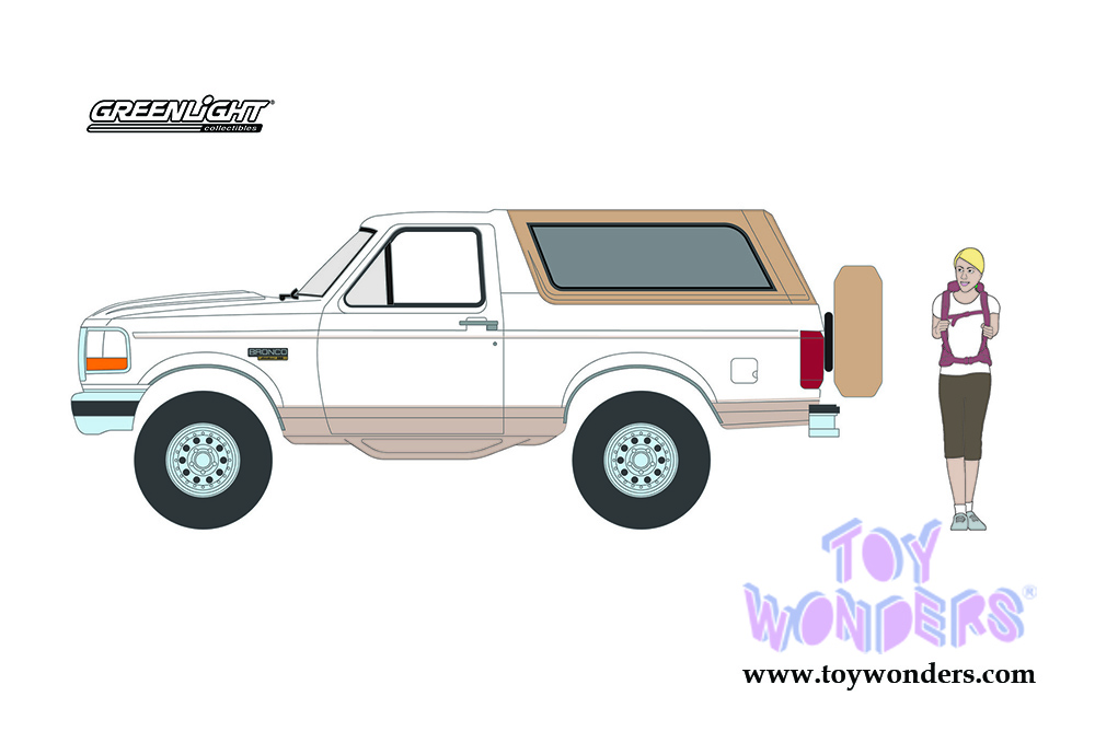 Greenlight - The Hobby Shop Series 10 | Ford Bronco Eddie Bauer with Backpacker (1996, 1/64 scale diecast model car, Oxford White/Light Saddle) 97100F/48