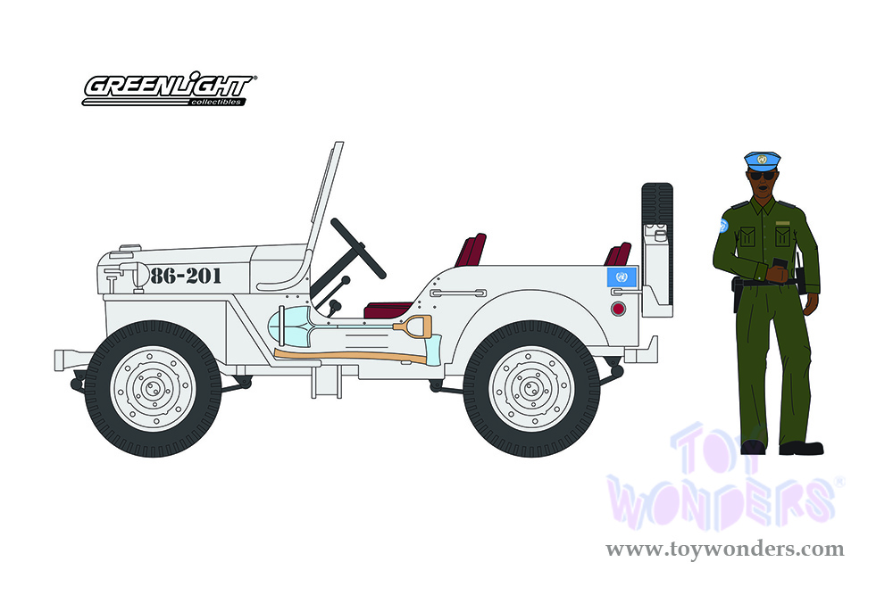 97110A/48 Greenlight - The Hobby Shop Series 11 | 1942 Willys MB Jeep® UN "United Nations" White and Security Officer Figurine, 6 pcs set. 1:64 scale diecast collectible model car. This Jeep® is 2.25" long. Packed in an individual Blister Pack. Pack size: 7.5"L x 5.5"W. 6 pcs per inner. 97110A/48 is in White.