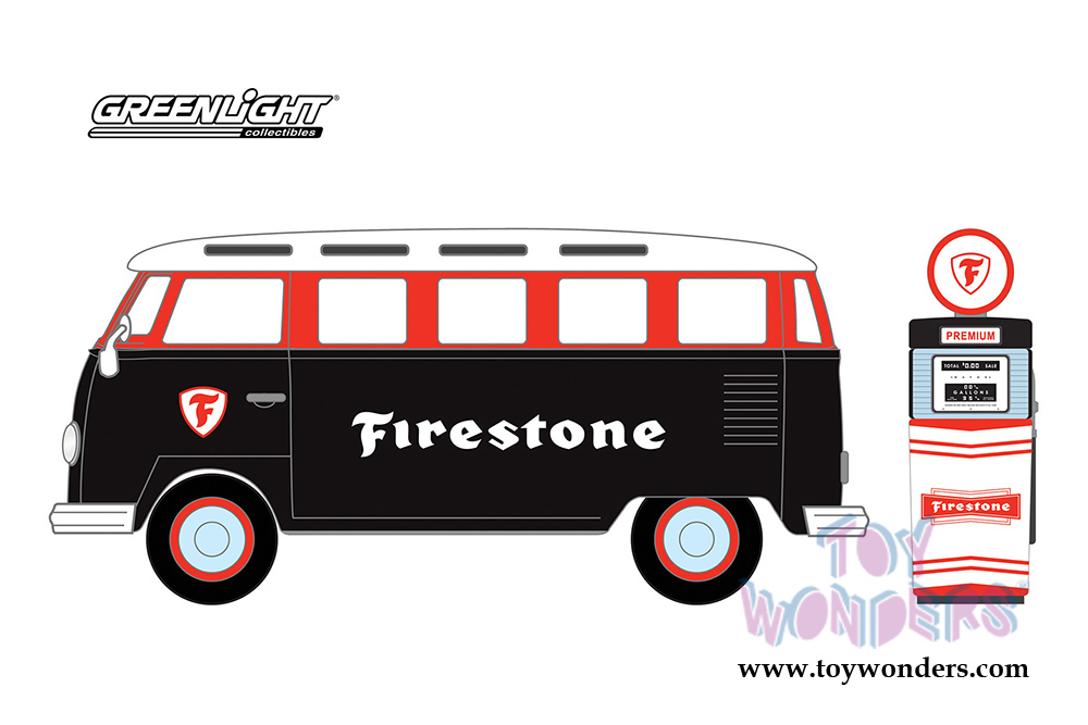 Greenlight - The Hobby Shop Series 6 | Volkswagen Samba Bus with Firestone Gas Pump (1964, 1/64 scale diecast model car, Red/Black) 97060A/48