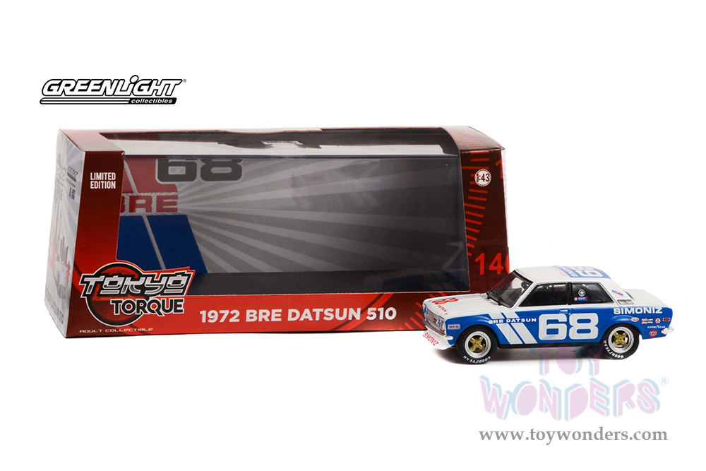 Greenlight - Tokyo Torque BRE (Brock Racing Enterprises) #68 Datsun 510 Guest Car - Peter Gregg (1972, 1/43 scale diecast model car, Blue/White) 86346