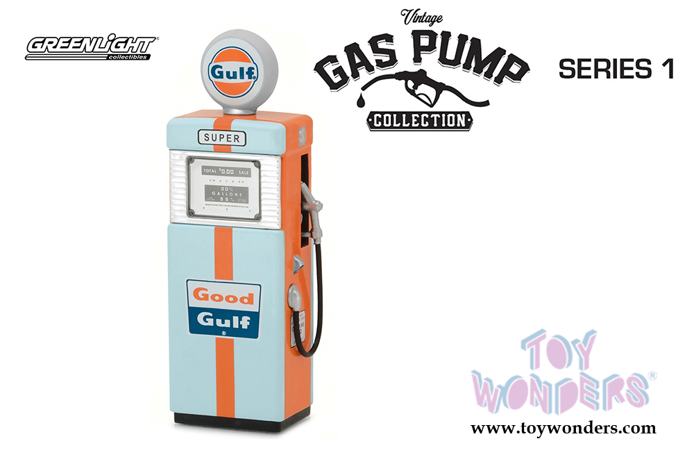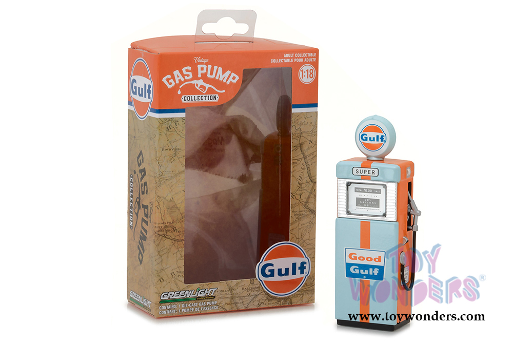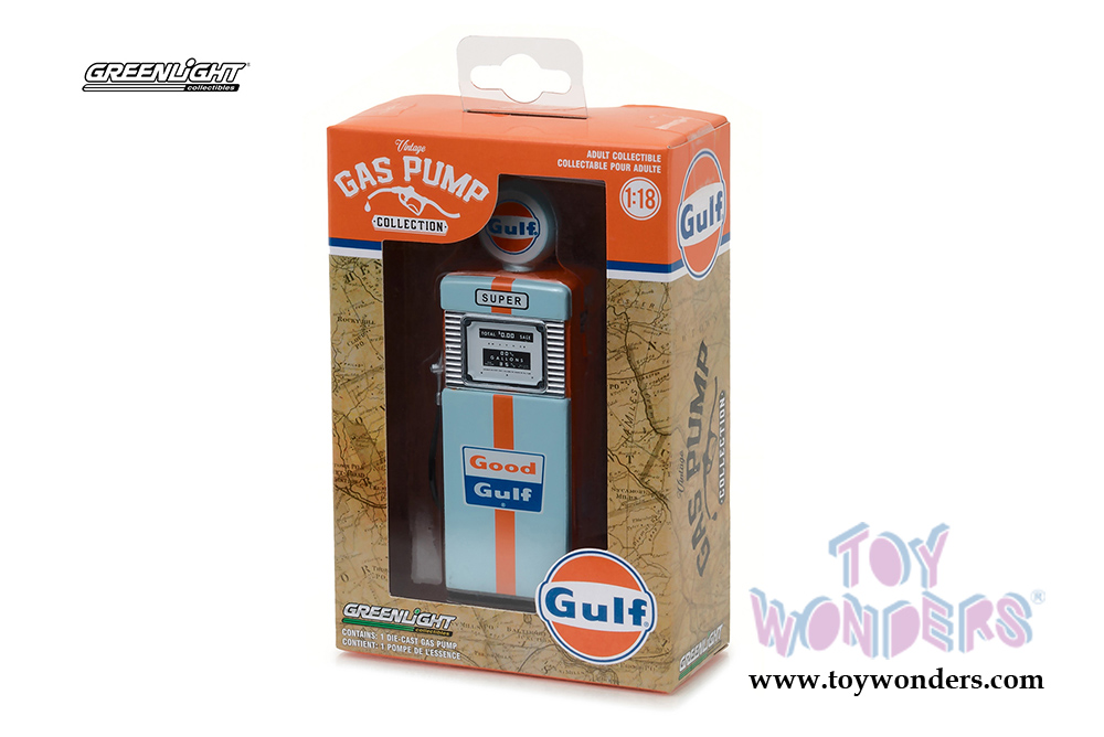 14010A Greenlight - Vintage Gas Pumps Series 1 | 1951 Wayne Gulf. 1:18 scale diecast vintage car gas pump. 4" H die cast toy Gulf gasoline pump replica. Contains small detachable parts. This antique fuel gas pump showed up in service stations throughout America in the 1940's through late 1950. Vintage Logos and decoration. True to scale detail. Limited edition. Manufactured by Greenlight. Old fashion gas pump for scale model cars. 12 pcs per inner box. Individually packed in a box. Box size: 3.5"Wx 5.25"Hx 1.75"D. This accessory is ideal for 1/18 scale dioramas.