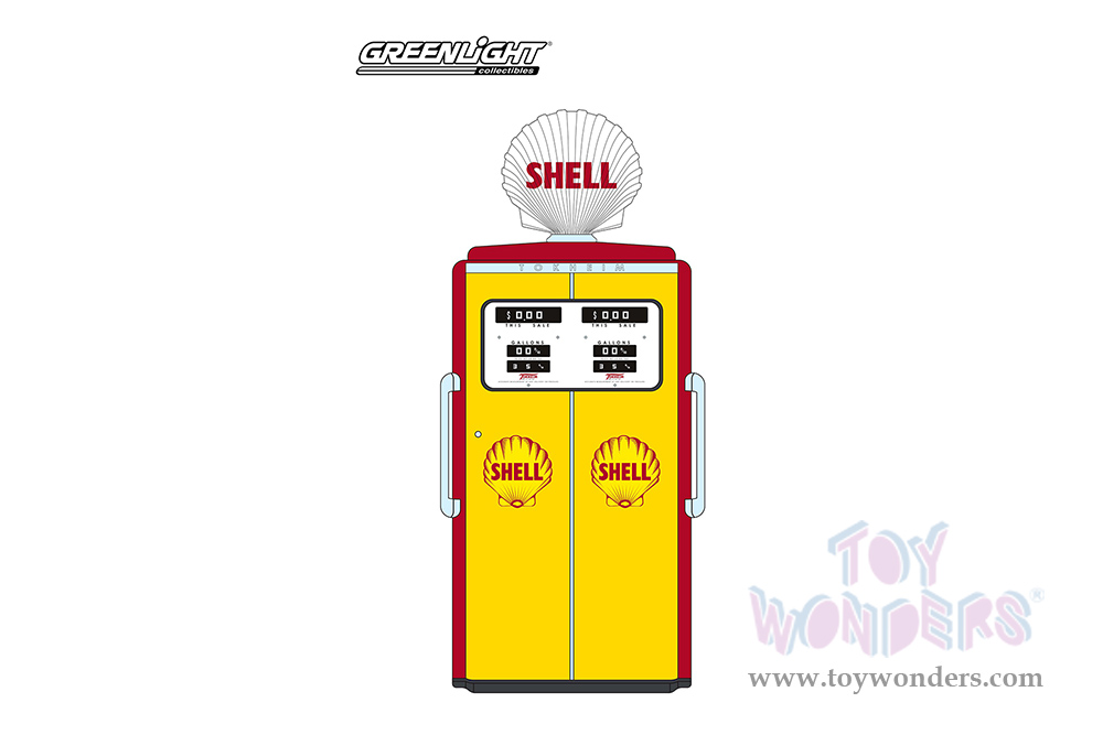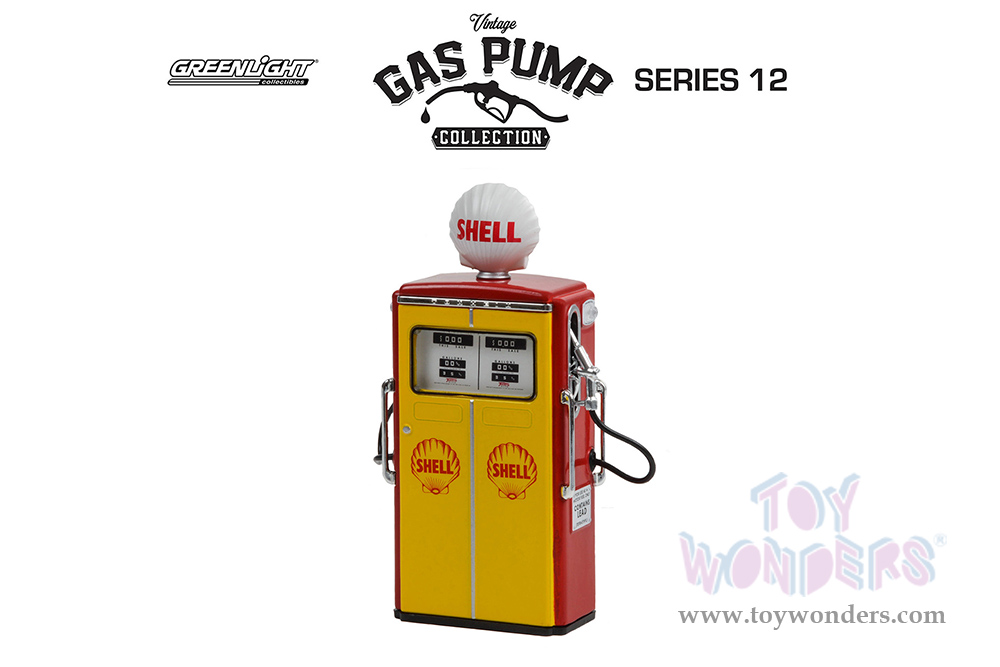 14120C/24 Greenlight - Vintage Gas Pumps Series 12 | 1954 Tokheim 350 Twin Gas Pump - Shell Oil. 1:18 scale diecast vintage car gas pump. This is a 2.25"Lx 1.25"Wx 4"H die cast toy gasoline pump replica. Contains small detachable parts. These antique fuel gas pumps showed up in service stations throughout America in the 1940's through late 1950. Manufactured by Greenlight. Old fashion gas pump for scale model cars. Individually packed in a box. Box size: 3.5"W x 5.25"H x 1.75"D. This accessory is ideal for 1/18 scale dioramas.