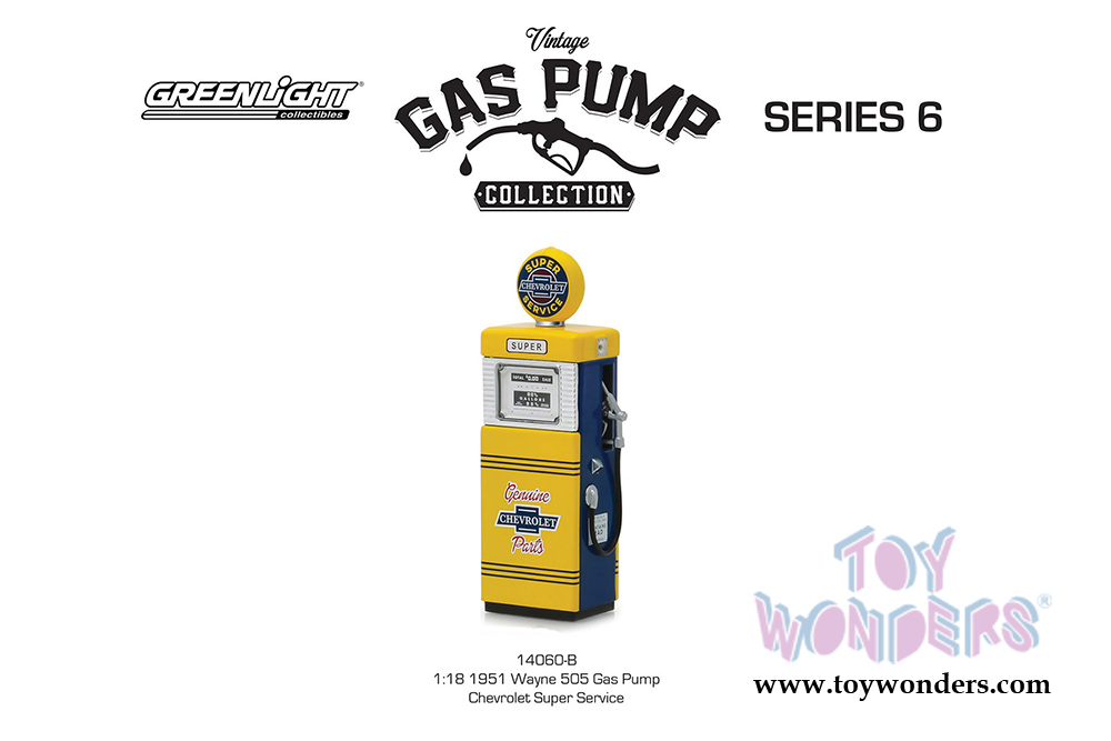 14060B/24 Greenlight - Vintage Gas Pumps Series 6 | 1951 Wayne 505 Gas Pump - Chevrolet Super Service. 1:18 scale diecast vintage car gas pump. 4" H die cast toy gasoline pump replicas. Contains small detachable parts. These antique fuel gas pumps showed up in service stations throughout America in the 1940's through late 1950. Manufactured by Greenlight. Old fashion gas pump for scale model cars. Individually packed in a box. Box size: 3.5"W x 5.25"H x 1.75"D. This accessory is ideal for 1/18 scale dioramas.