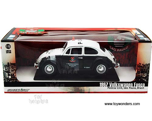 12853 Greenlight Policia Civil - 1967 Volkswagen Beetle Fusca - Sao Paulo Brazil Police. 1:18 scale diecast collectible model car. This Volkswagen Beetle is an 8.5"L x 3.25"W x 3.25"H diecast collection car with openable doors, hood & trunk. Limited edition. This 1967 VW Beetle is manufactured by Greenlight. 12853 is in BLACK & WHITE 2-tone colors. Individually packed in a window box. Box size: 14"L x 6"W x 5.25"H.