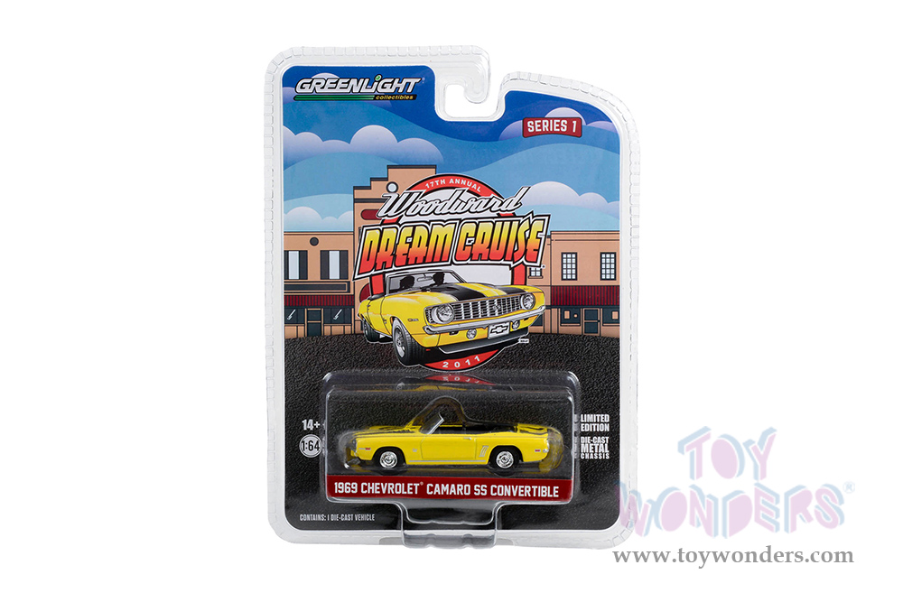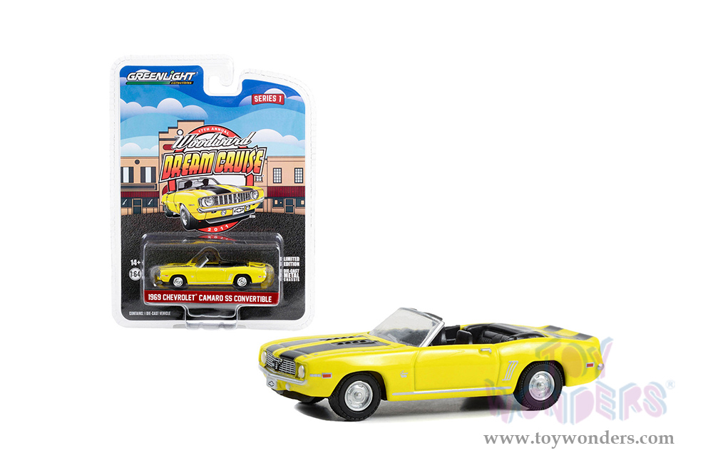 Greenlight - Woodward Dream Cruise Series 1 | Chevrolet® Camaro SS Convertible "17th Annual Woodward Dream Cruise Featured Heritage Vehicle" (2011) (1969, 1/64 scale diecast model car, Yellow with Black Stripes) 37280B/48