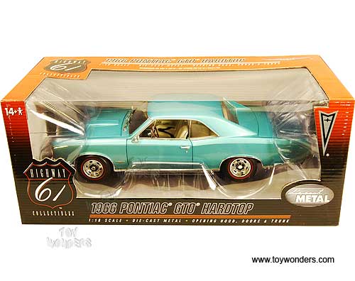 50584 Highway 61 - 1966 Pontiac GTO Hard Top. 1:18 scale diecast collectible model car. This Pontiac GTO is an 11.25"L x 4"W x 2.75"H die cast metal car with openable doors, hood & trunk, fully detailed engine, working suspension and steering, and soft interior & soft rubber tires. This 1966 Pontiac GTO is manufactured by Highway 61. Item 50584 is in REEF TURQUOISE BLUE color. Individually packed in a window box. Box size: 13.75"L x 6.5"W x 5.75"H. GM is a trademark of the General Motors Corporation.