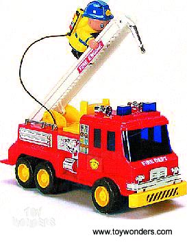 73388 Hook & Ladder Fire Engine. 12" bump-n-go action fire truck with fireman that climbs up & down a ladder. Flashing lights & siren sounds in a TRY ME box. Includes 3 "AA" batteries. Box size: 13.75"Lx6"Wx10"H.
