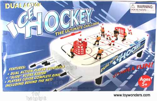 665 Dual Action Ice Hockey Game Set. The ultimate challenge. This game set features dual action player controls, "slide" score keeper, players cover complete rink. Including behind the net! Box size: 23.25"L x 14"W x 2.75"H.