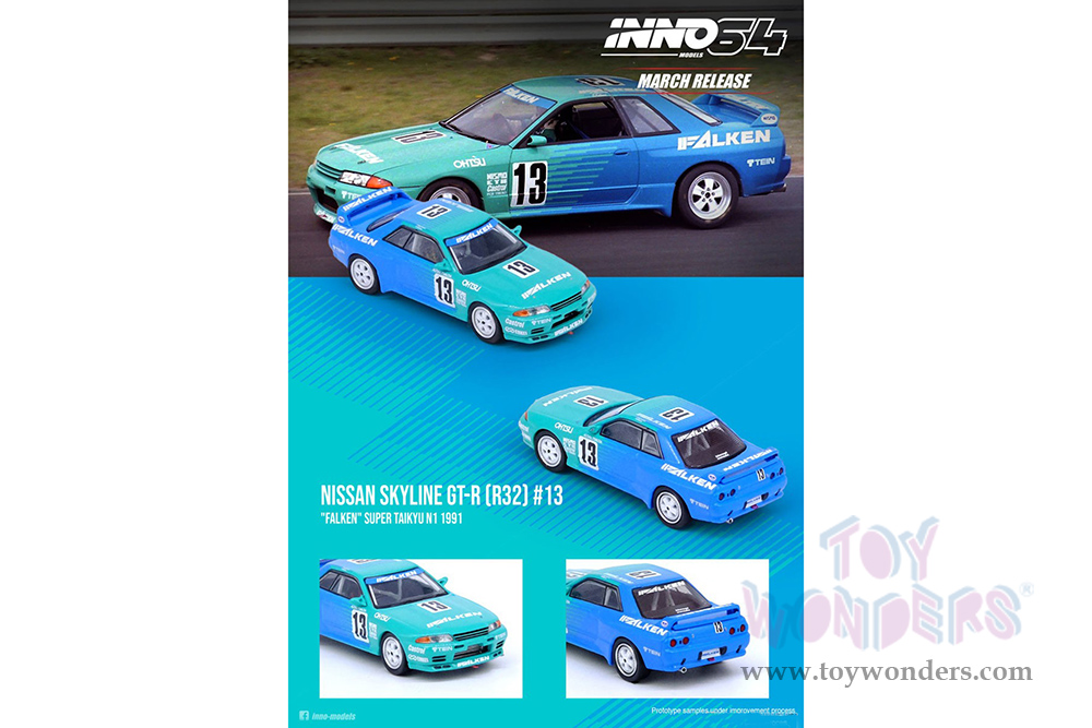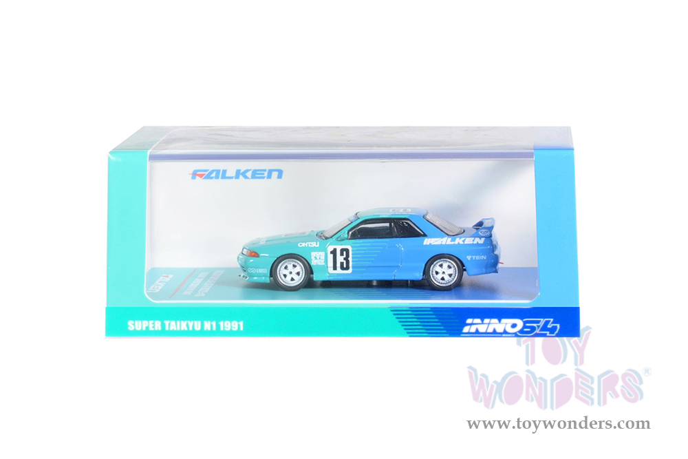 Inno Models - Nissan Skyline GT-R (R32) #13 "Falken Tires" Super Taikyu N1 (1991)(1/64 scale diecast model car, Green/Blue) IN64R32-FAL