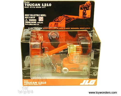 1210 JLG Aerial Work Platform Series 3 - Toucan Mast Style Boom Lift. 1:32 scale diecast collectible model. This Toucan Mast Style Boom Lift is 2.5" long. Manufactured by JLG Industries, Inc. Individually packed in a window box. Box size: 7"L x 3.5"W x 4"H. 1210 is in ORANGE color.