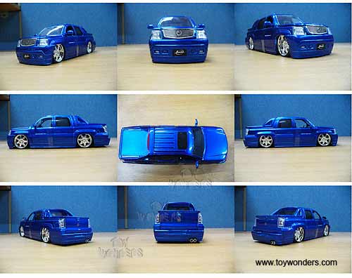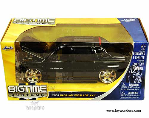 92054 Jada Toys Bigtime Kustoms - 2002 Cadillac Escalade EXT Pickup Truck with Sunroof. 1:24 scale diecast collectible model. This 1959 Cadillac Escalade EXT Pick-up is a 9.25"L x 3.25'W x 2.75'H die cast with openable doors, hood & tailgate, and GFG Cannes rims. This 2002 Cadillac Escalade EXT Pickup is manufactured by Jada Toys. Big Time. Individually packed in a window box WB. Box size: 10"Lx 4.75"Wx 4.75"H. 6 pcs per inner box. GM is a trademark of the General Motors Corporation.